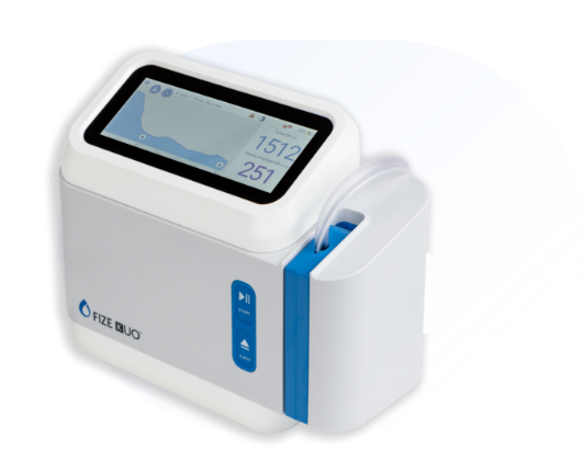 The FIZE kUO platform consists of a bedside monitor and a disposable kit. It offers hourly and trend-based visualizations, with customizable clinical and operational alerts.